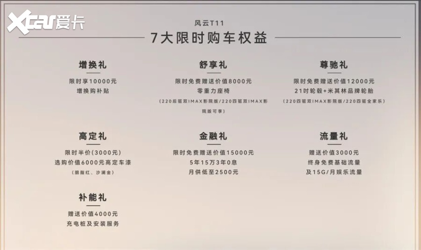 近期正式上市的风云T11,推出4款装备,限时抢鲜价17.99万-23.99万元。新车定位智享大六座旗舰SUV,以超安全、大空间、更奢华、好才智四大中心价值,从头划定家用奢华SUV规范。全系标配11项安全气囊、磐石车身等硬核装备,结合极具诚心的价格,让百万级奢华体会触手可及。而且有着丰盛的限时购车权益:10000元增换购补助,赠送零重力座椅,21寸轮毂,充电桩和免费流量,在从购车、用车到后期养车等多重维度下降用户门槛与本钱,显着提高了新车的性价比和商场吸引力。