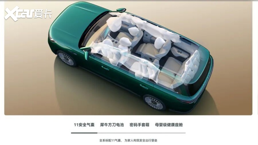 安全装备:全系标配11安全气囊,含主驾膝部气囊、2200mm侧气帘、双腔远端气囊、后风窗气囊,合作磐石车身2.0,88%高强度钢铝,打造家庭移动安全堡垒;